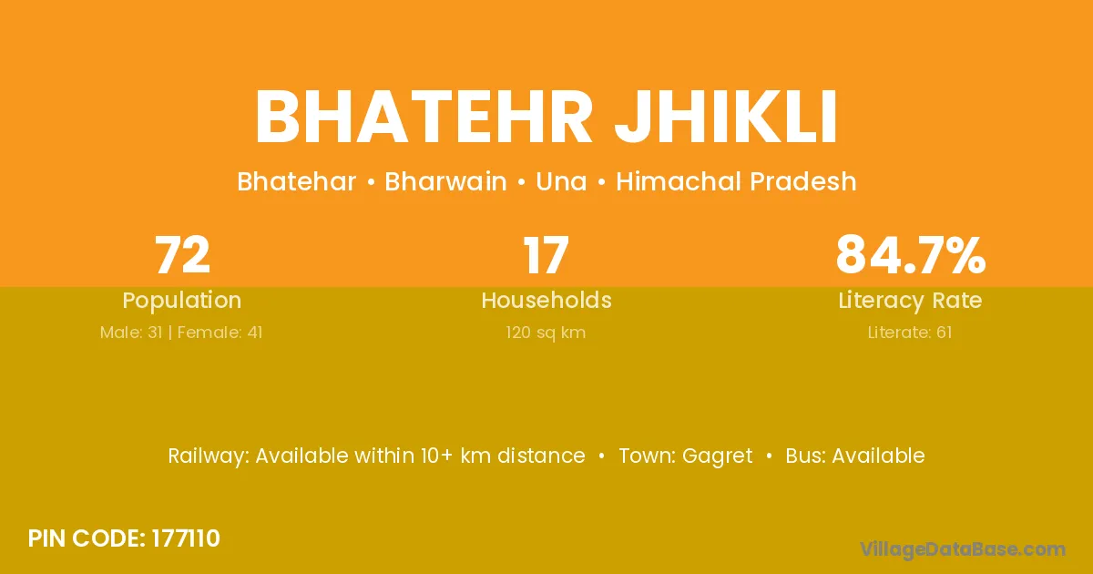 Bhatehr Jhikli village has a total population of 72 people, of which 31 are males and 41 are females.