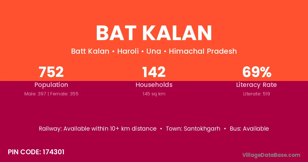 Bat Kalan village has a total population of 752 people, of which 397 are males and 355 are females.