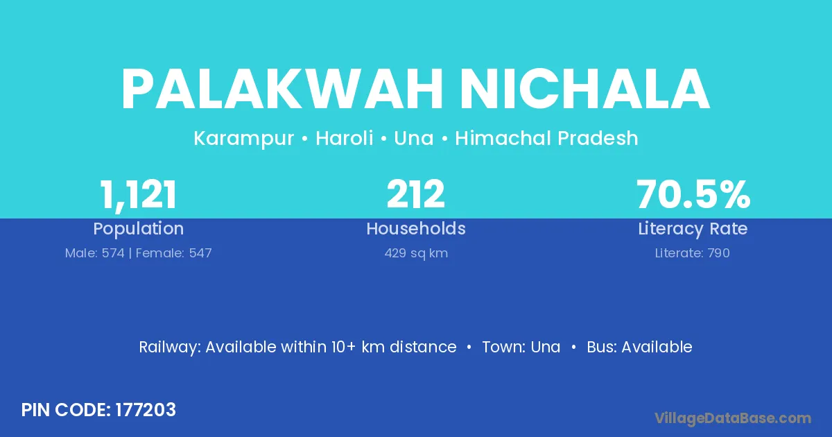 Palakwah Nichala village has a total population of 1,121 people, of which 574 are males and 547 are females.