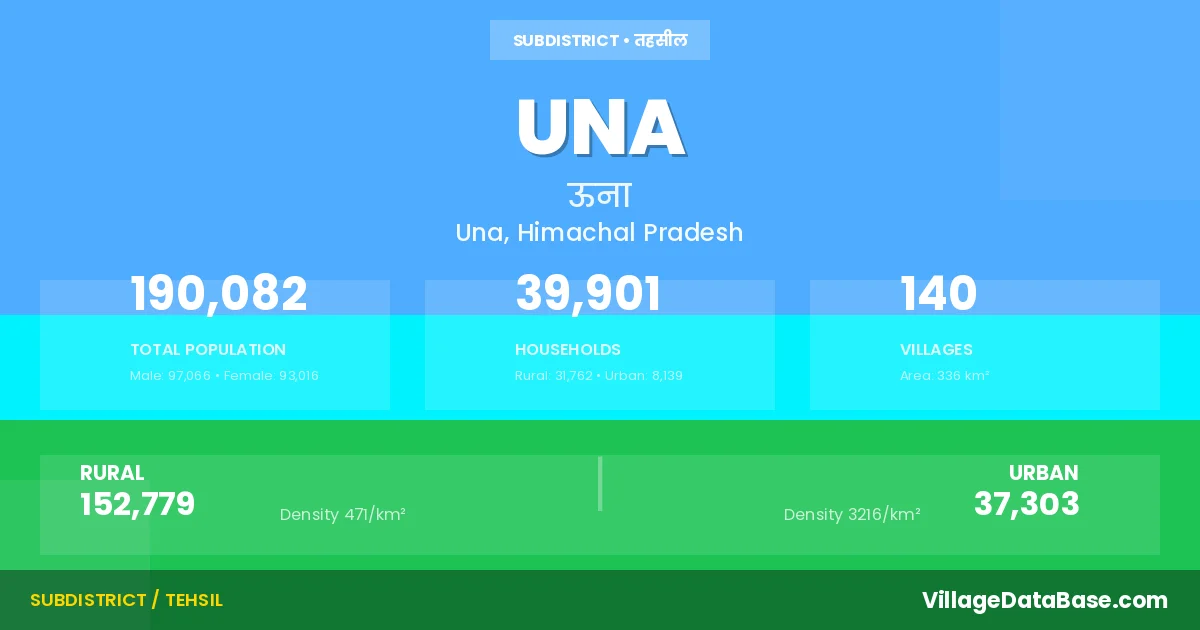 According to the 2011 census The total area of Una Tehsil is 336 km², with a population of 190082 people. The population density is 566 inhabitants per square kilometre, and there are approximately 39901 houses in the sub district.