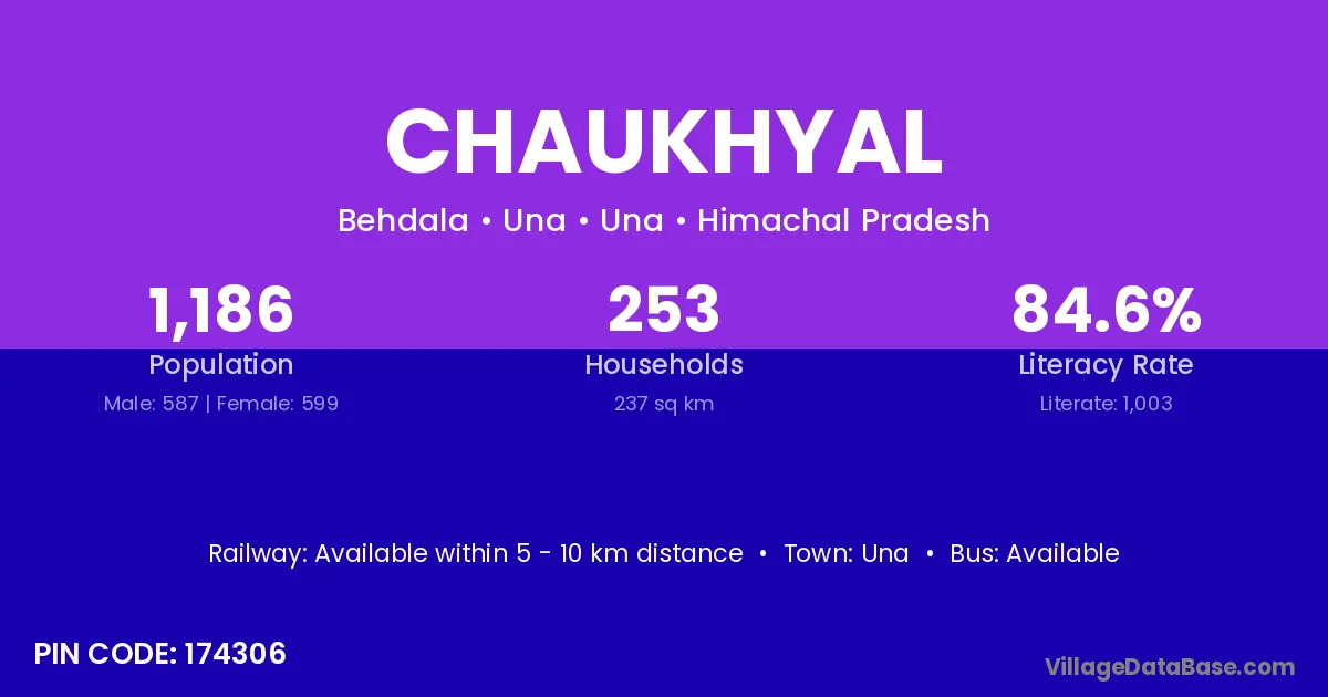 Chaukhyal village has a total population of 1,186 people, of which 587 are males and 599 are females.