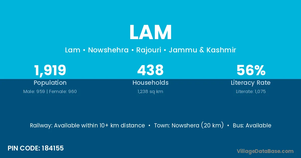 The literacy rate of Lam village is 78.95%. Male literacy stands at 82.57% and female literacy at 75.00%.