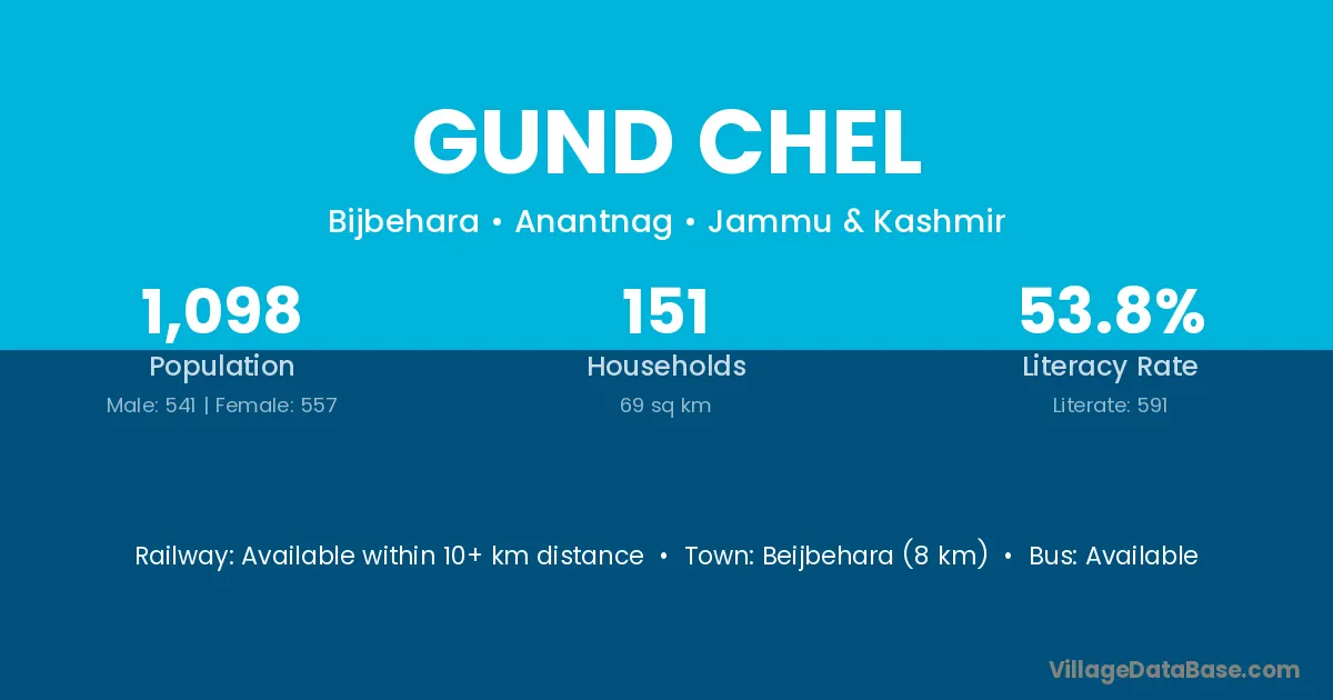 Beijbehara (8 km) is the nearest town to Gund Chel village for major economic activities and is located approximately 8 km away.