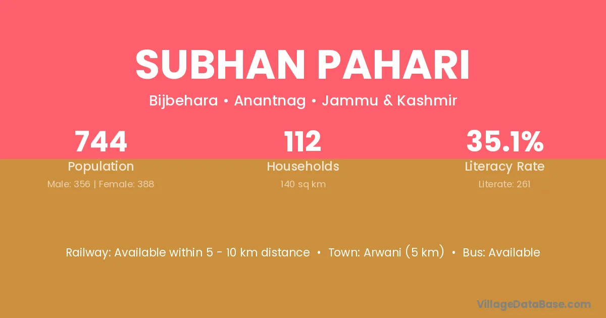 Arwani (5 km) is the nearest town to Subhan Pahari village for major economic activities and is located approximately 5 km away.