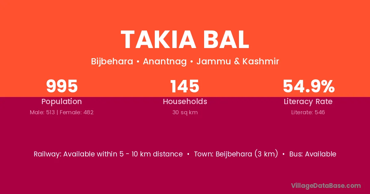 Takia Bal village has a total population of 995 people, of which 513 are males and 482 are females.