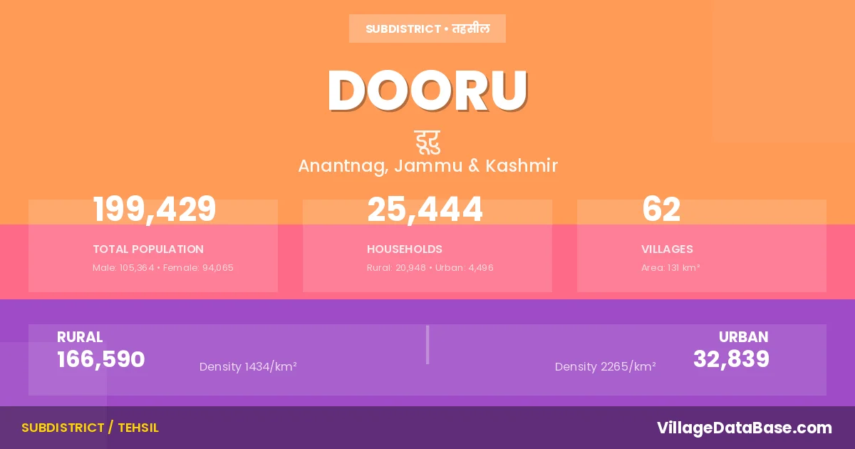 According to the 2011 census The total area of Dooru Tehsil is 131 km², with a population of 199429 people. The population density is 1,526 inhabitants per square kilometre, and there are approximately 25444 houses in the sub district.