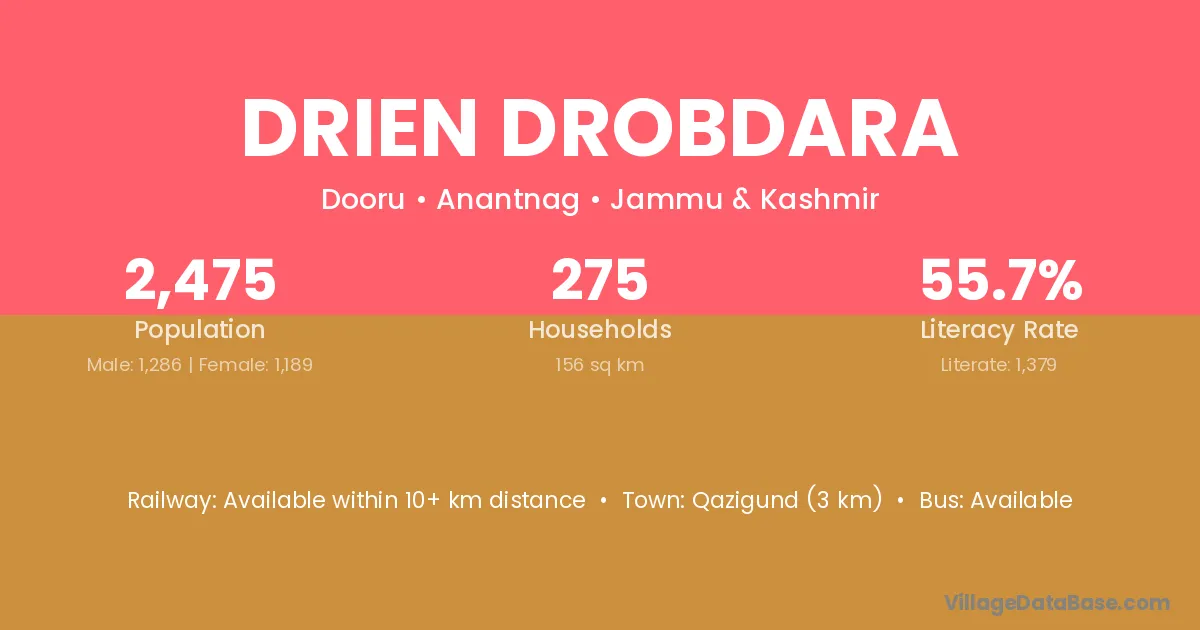 Qazigund (3 km) is the nearest town to Drien Drobdara village for major economic activities and is located approximately 3 km away.