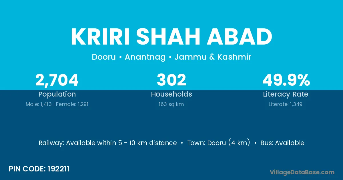 Dooru (4 km) is the nearest town to Kriri Shah Abad village for major economic activities and is located approximately 4 km away.