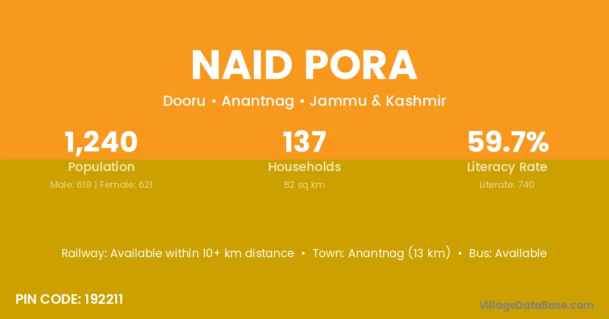 Anantnag (13 km) is the nearest town to Naid Pora village for major economic activities and is located approximately 13 km away.