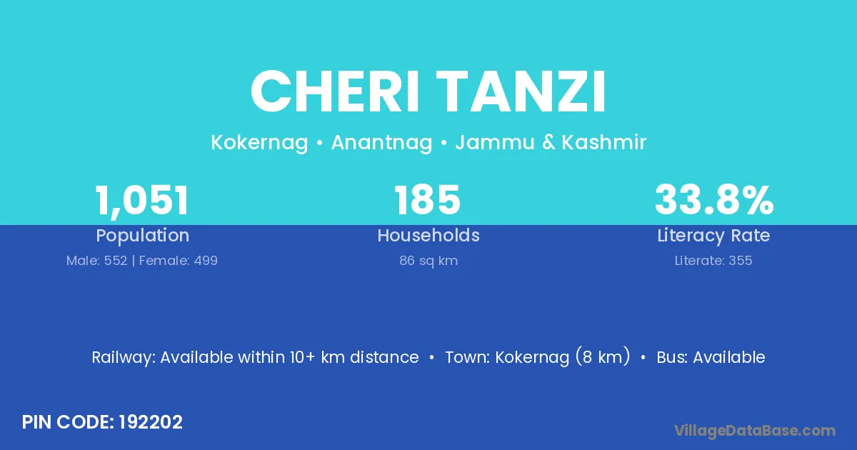 Kokernag (8 km) is the nearest town to Cheri Tanzi village for major economic activities and is located approximately 8 km away.