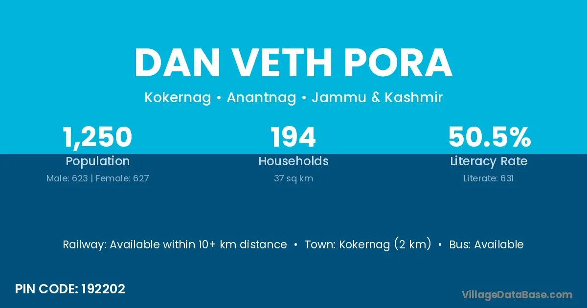 Kokernag (2 km) is the nearest town to Dan Veth Pora village for major economic activities and is located approximately 2 km away.