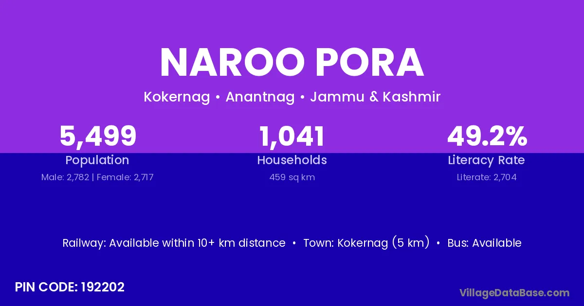 Kokernag (5 km) is the nearest town to Naroo Pora village for major economic activities and is located approximately 5 km away.
