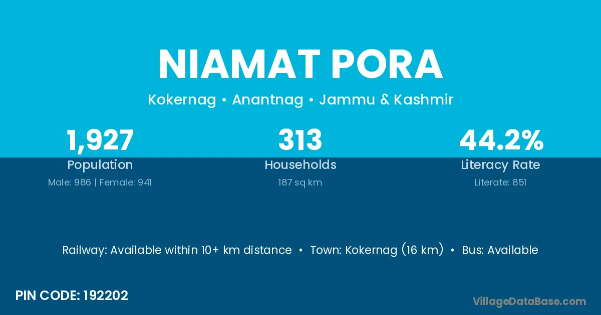 Kokernag (16 km) is the nearest town to Niamat Pora village for major economic activities and is located approximately 16 km away.