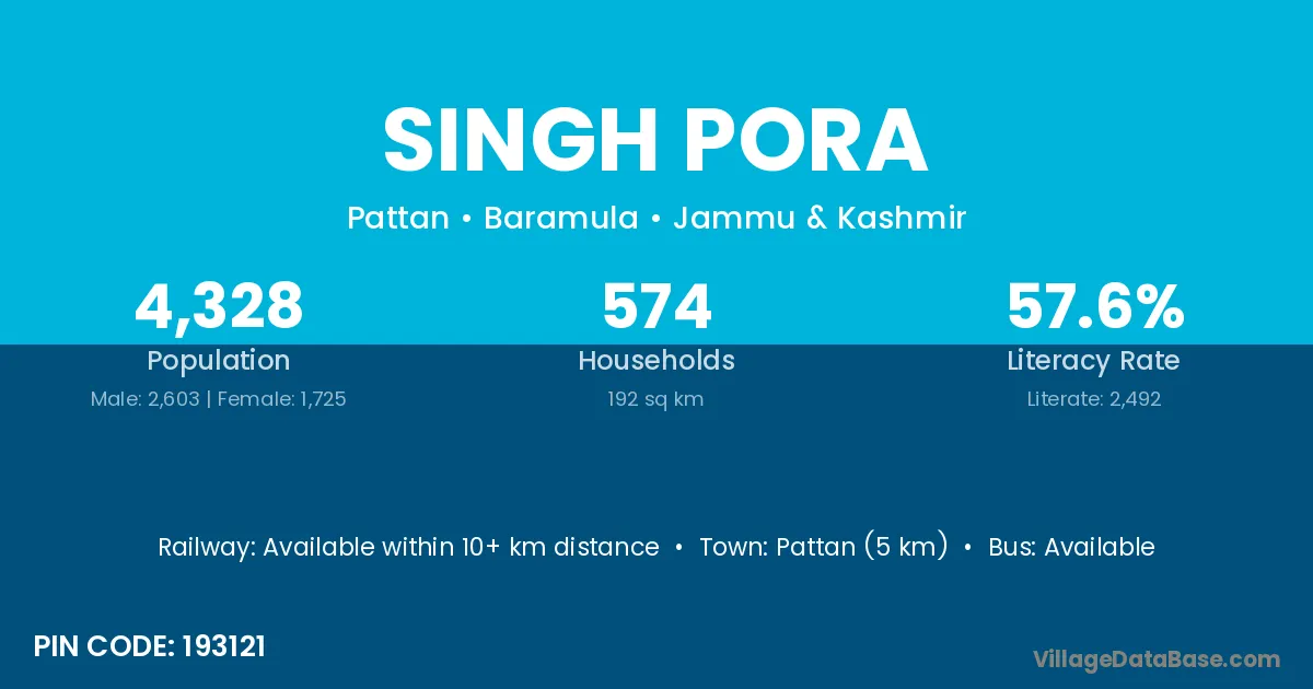 Ashmuqam (6 km) is the nearest town to Singh Pora village for major economic activities and is located approximately 6 km away.