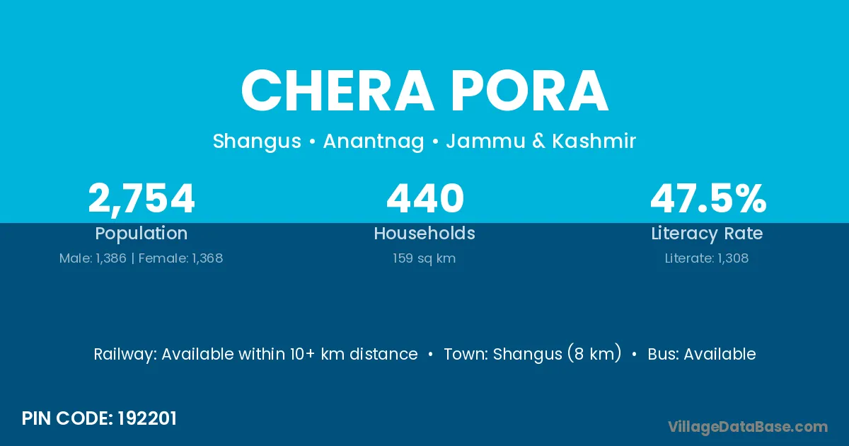 Shangus (8 km) is the nearest town to Chera Pora village for major economic activities and is located approximately 8 km away.
