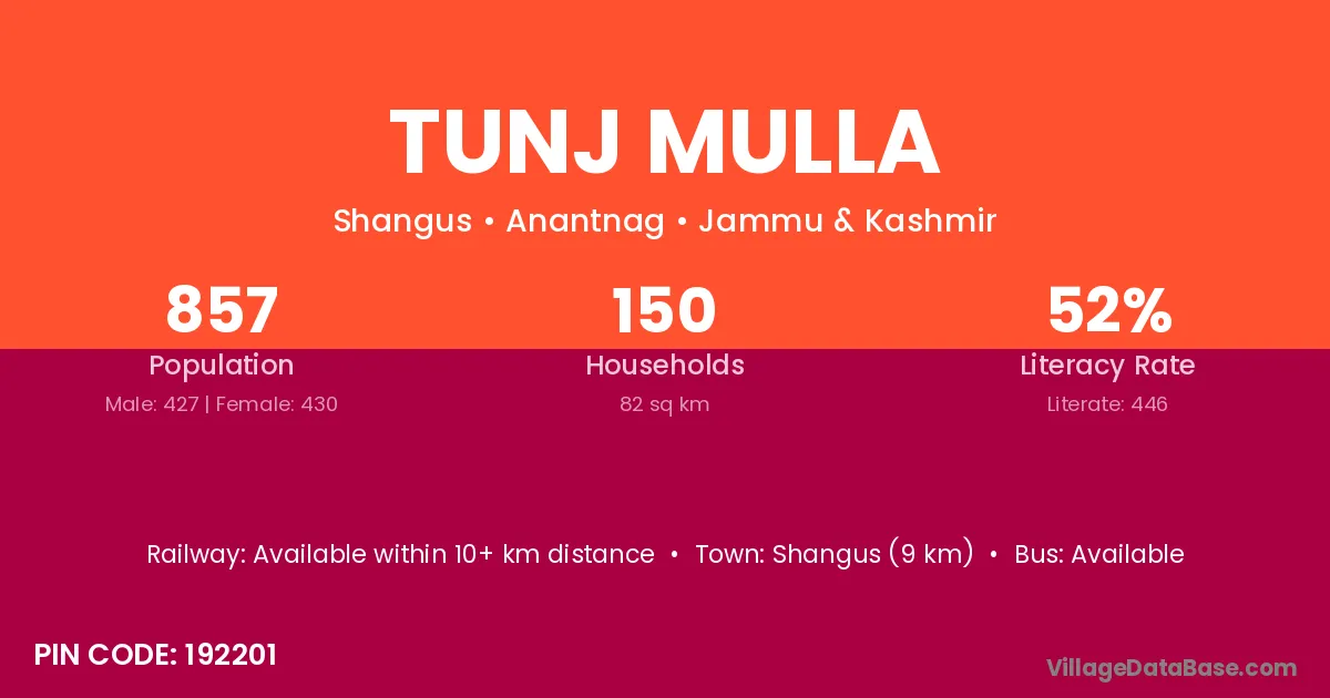 Tunj Mulla village has a total population of 857 people, of which 427 are males and 430 are females.