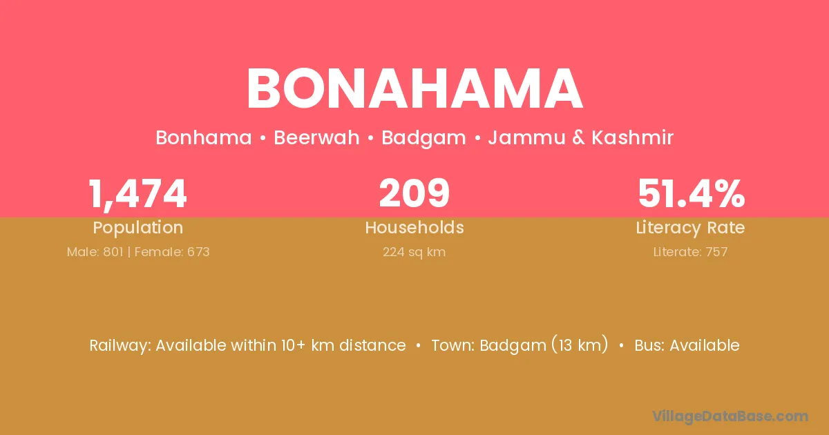 Badgam (13 km) is the nearest town to Bonahama village for major economic activities and is located approximately 13 km away.