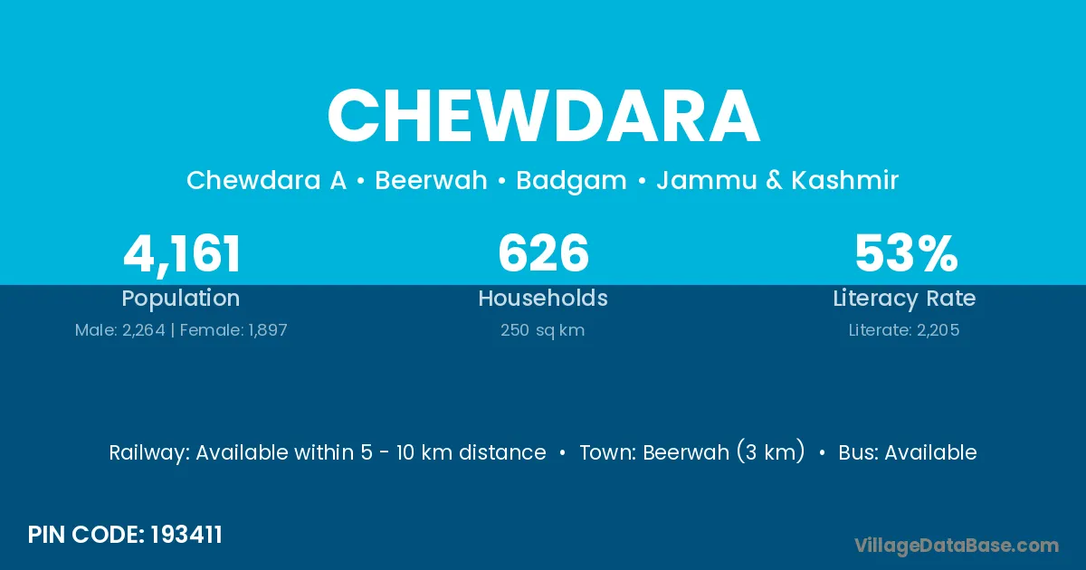 Beerwah (3 km) is the nearest town to Chewdara village for major economic activities and is located approximately 3 km away.