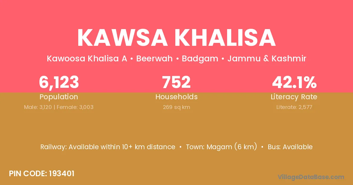 Kawsa Khalisa village has a total population of 6,123 people, of which 3,120 are males and 3,003 are females.