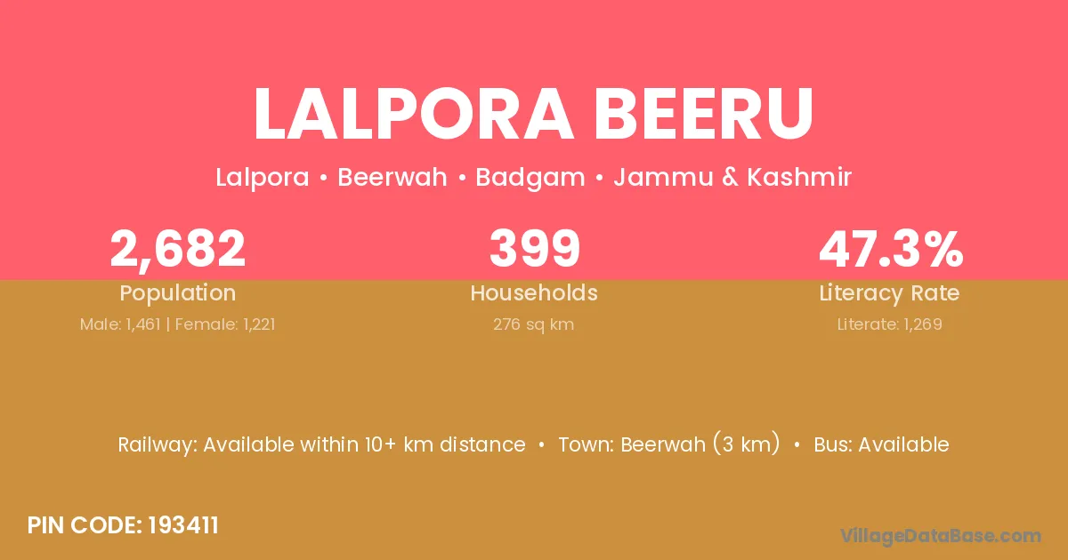 Beerwah (3 km) is the nearest town to Lalpora Beeru village for major economic activities and is located approximately 3 km away.