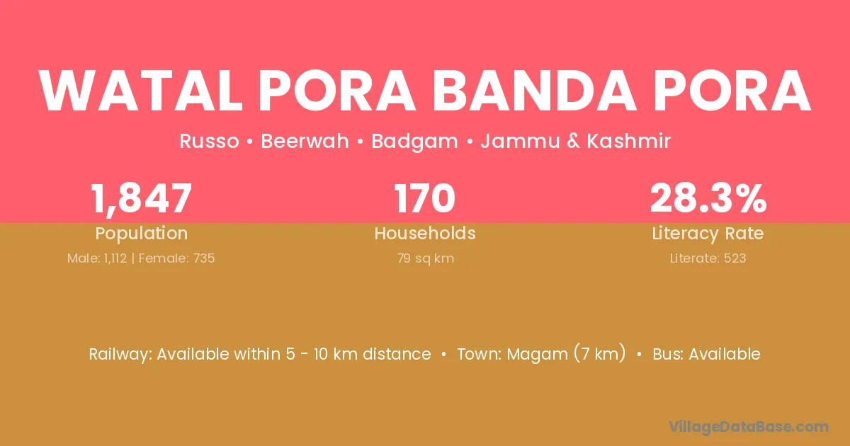Watal Pora Banda Pora village has a total population of 1,847 people, of which 1,112 are males and 735 are females.