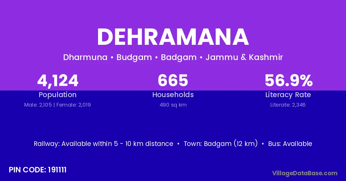 Badgam (12 km) is the nearest town to Dehramana village for major economic activities and is located approximately 12 km away.