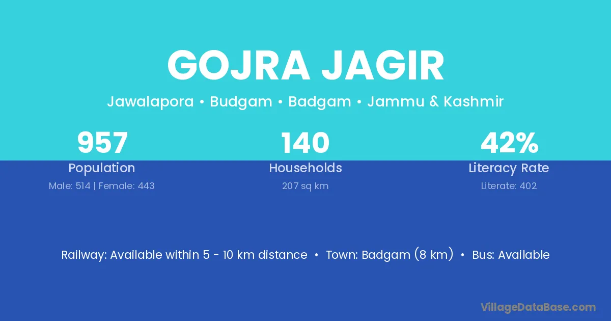 Badgam (8 km) is the nearest town to Gojra Jagir village for major economic activities and is located approximately 8 km away.