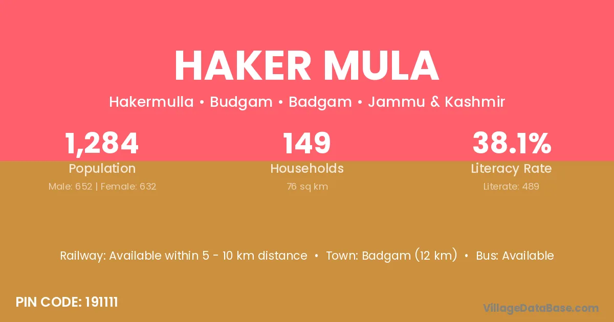 Badgam (12 km) is the nearest town to Haker Mula village for major economic activities and is located approximately 12 km away.