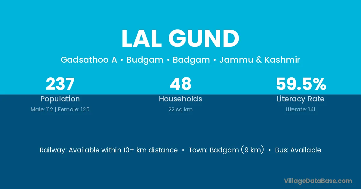 Badgam (9 km) is the nearest town to Lal Gund village for major economic activities and is located approximately 9 km away.