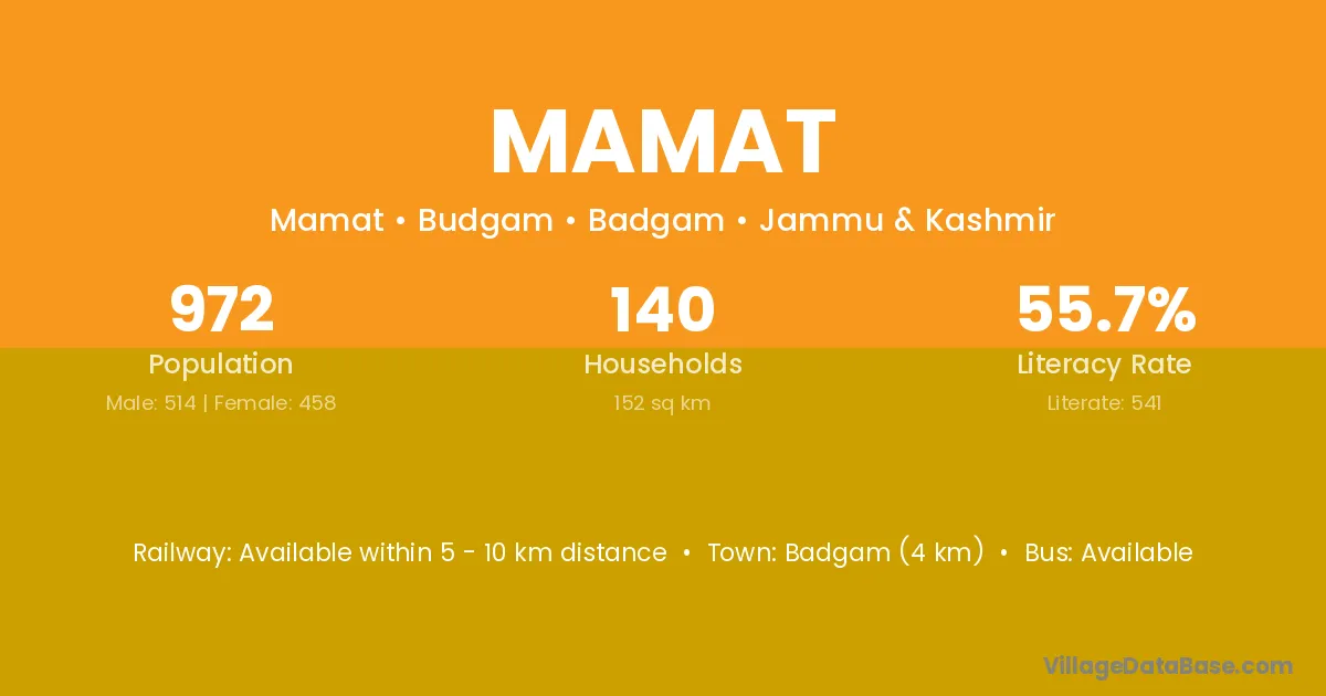 Badgam (4 km) is the nearest town to Mamat village for major economic activities and is located approximately 4 km away.