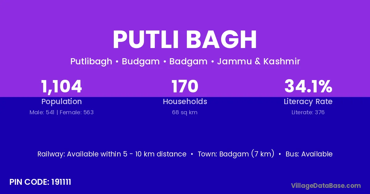 Badgam (7 km) is the nearest town to Putli Bagh village for major economic activities and is located approximately 7 km away.