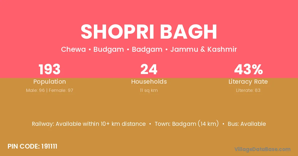 Badgam (14 km) is the nearest town to Shopri Bagh village for major economic activities and is located approximately 14 km away.