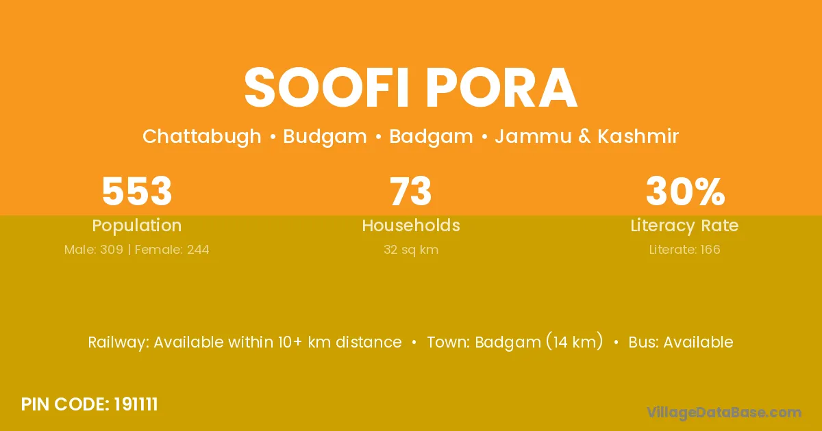 Badgam (14 km) is the nearest town to Soofi Pora village for major economic activities and is located approximately 14 km away.
