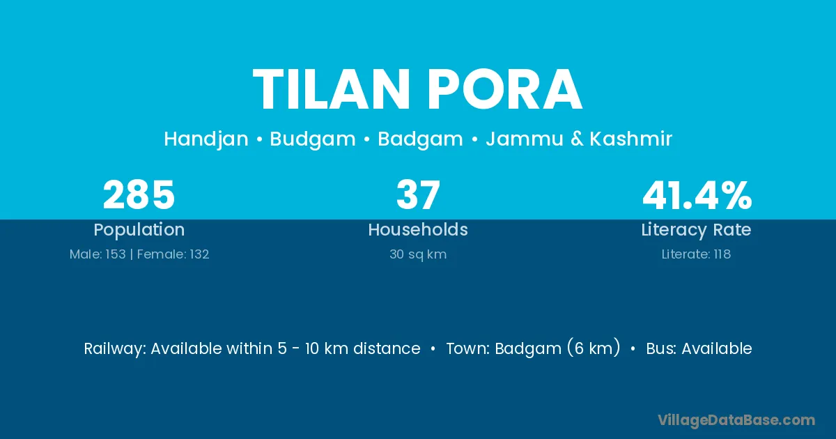 Badgam (6 km) is the nearest town to Tilan Pora village for major economic activities and is located approximately 6 km away.