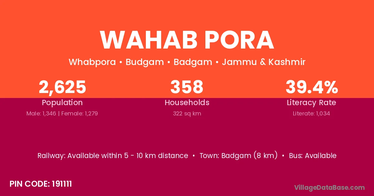 Badgam (8 km) is the nearest town to Wahab Pora village for major economic activities and is located approximately 8 km away.