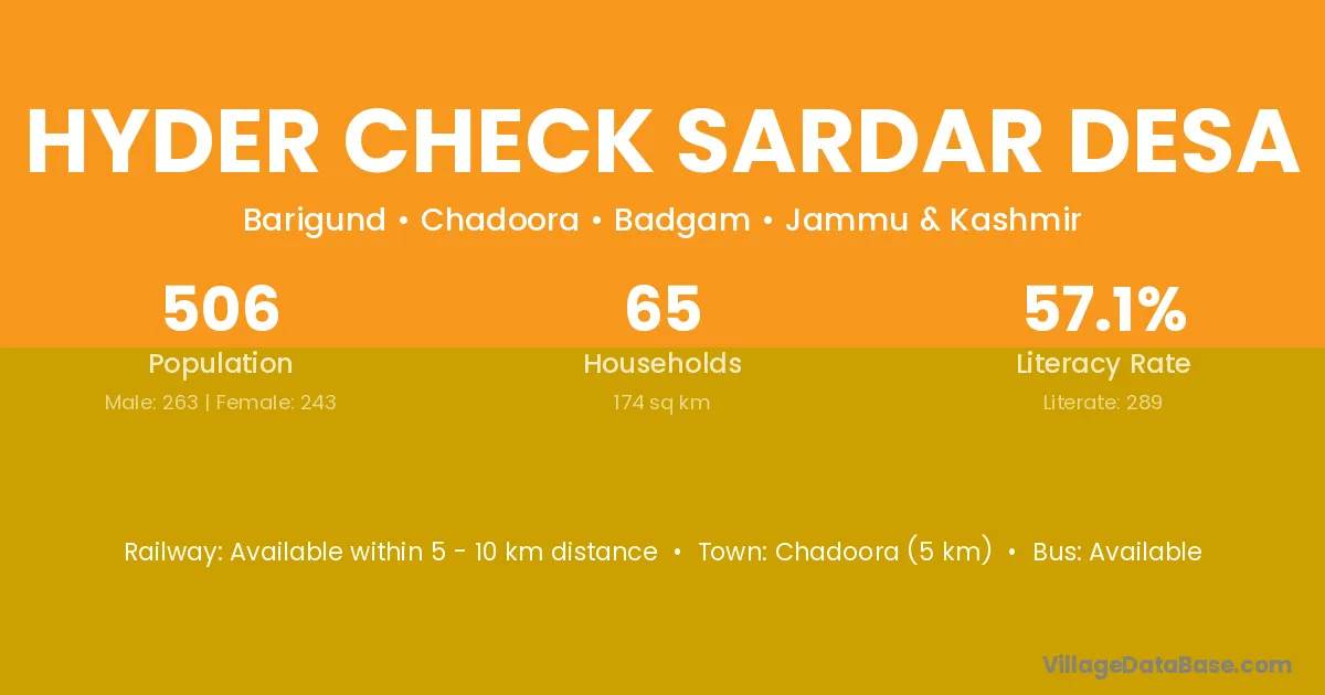 Chadoora (5 km) is the nearest town to Baghi Hyder Check Sardar Desa Singh village for major economic activities and is located approximately 5 km away.