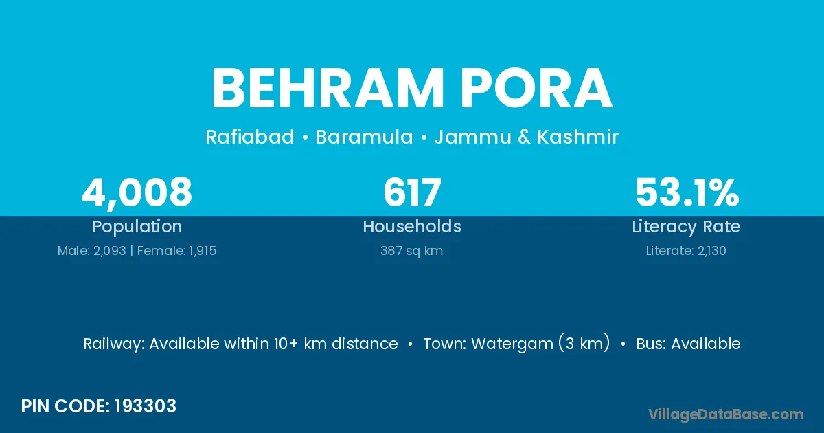 Chadoora (8 km) is the nearest town to Behram Pora village for major economic activities and is located approximately 8 km away.