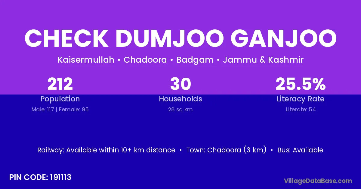 Chadoora (3 km) is the nearest town to Check Dumjoo Ganjoo village for major economic activities and is located approximately 3 km away.