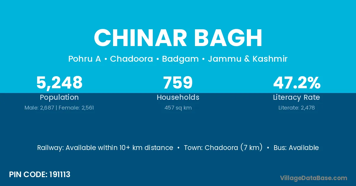 Chadoora (7 km) is the nearest town to Chinar Bagh village for major economic activities and is located approximately 7 km away.