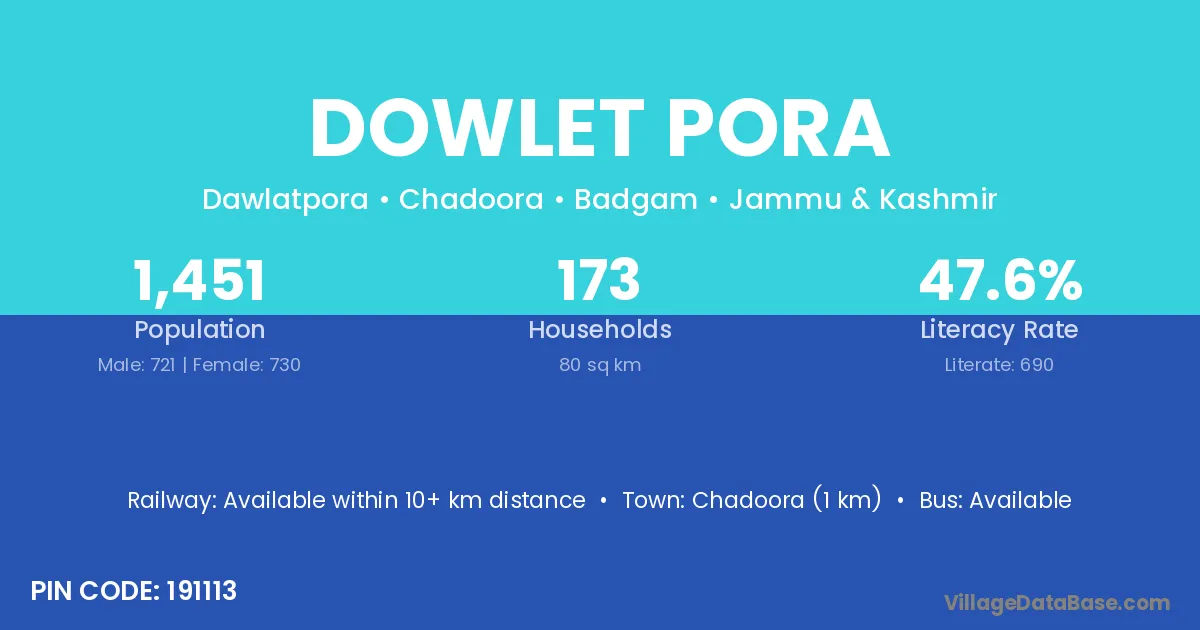 Chadoora (1 km) is the nearest town to Dowlet Pora village for major economic activities and is located approximately 1 km away.