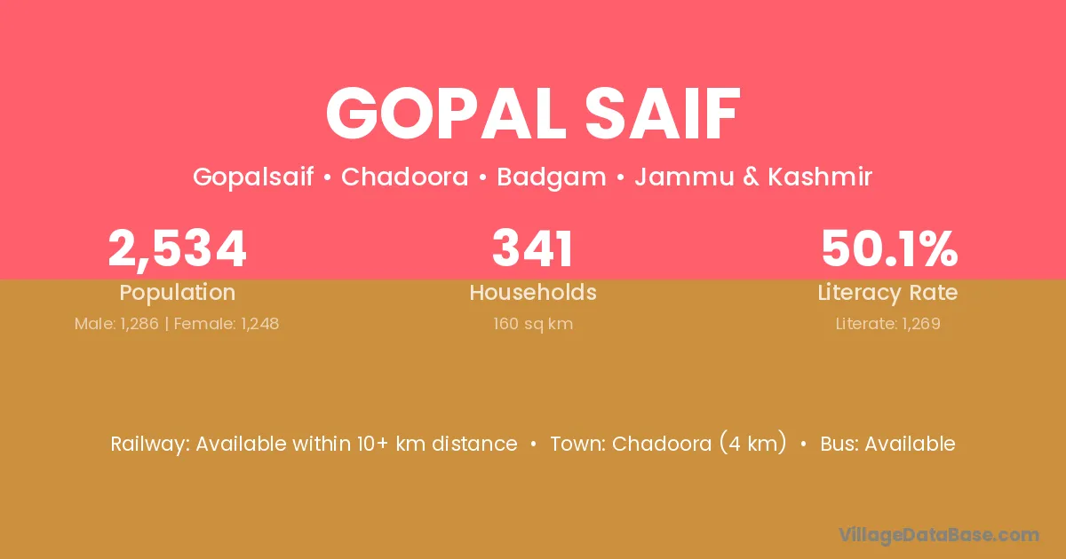 Chadoora (4 km) is the nearest town to Gopal Saif village for major economic activities and is located approximately 4 km away.