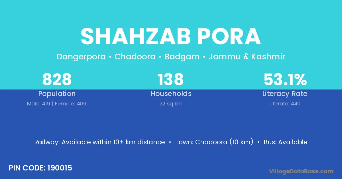 Shahzab Pora village has a total population of 828 people, of which 419 are males and 409 are females.