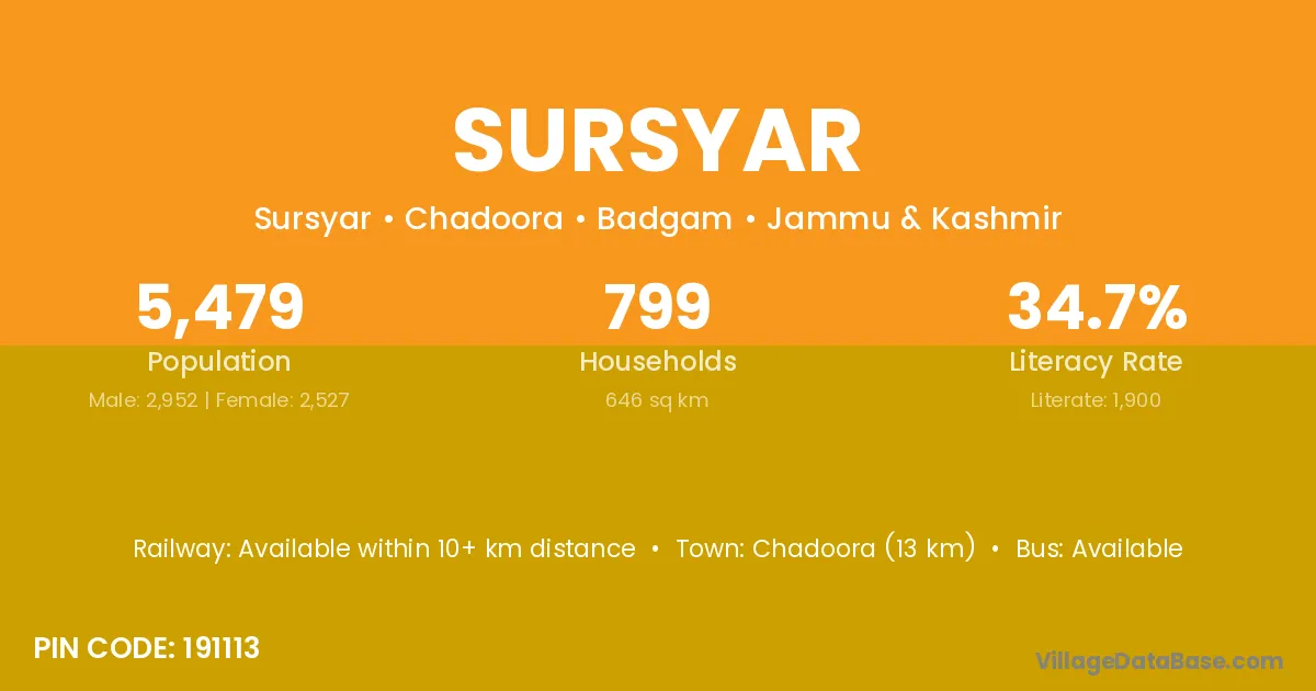 Chadoora (13 km) is the nearest town to Sursyar village for major economic activities and is located approximately 13 km away.
