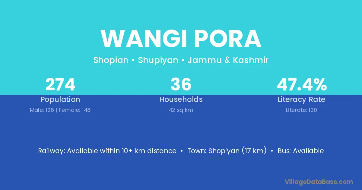Chadoora (10 km) is the nearest town to Wangi Pora village for major economic activities and is located approximately 10 km away.