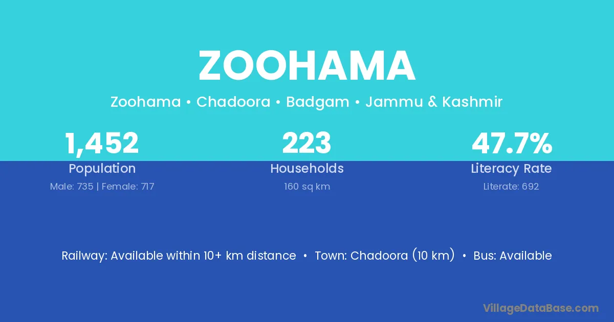 Chadoora (10 km) is the nearest town to Zoohama village for major economic activities and is located approximately 10 km away.