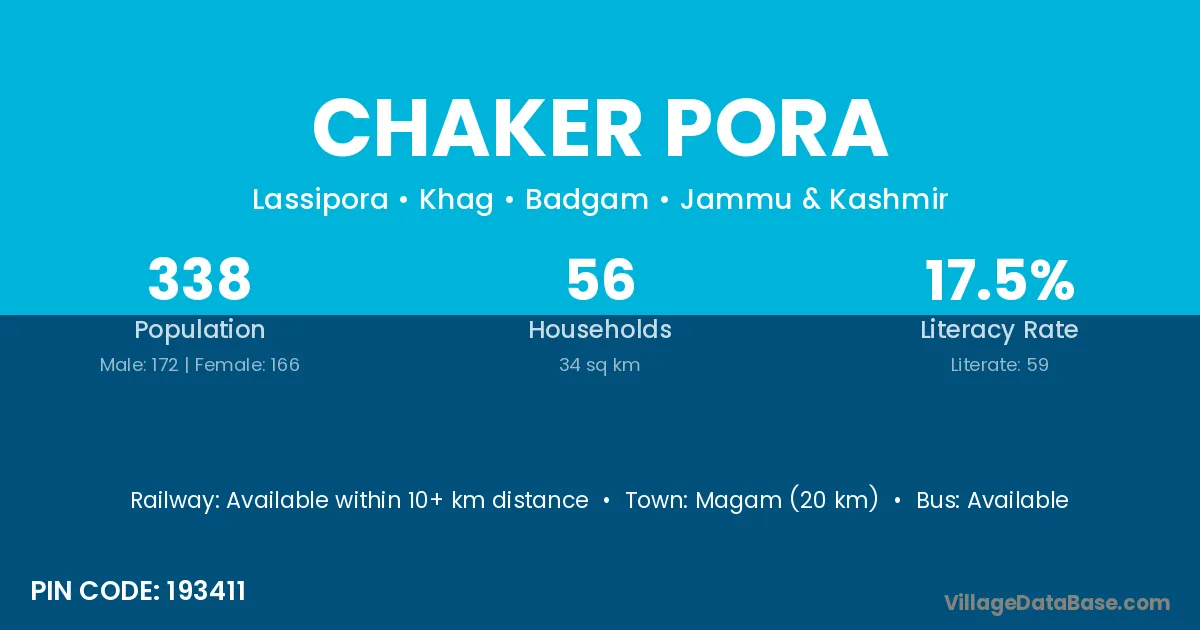 Chaker Pora village has a total population of 338 people, of which 172 are males and 166 are females.