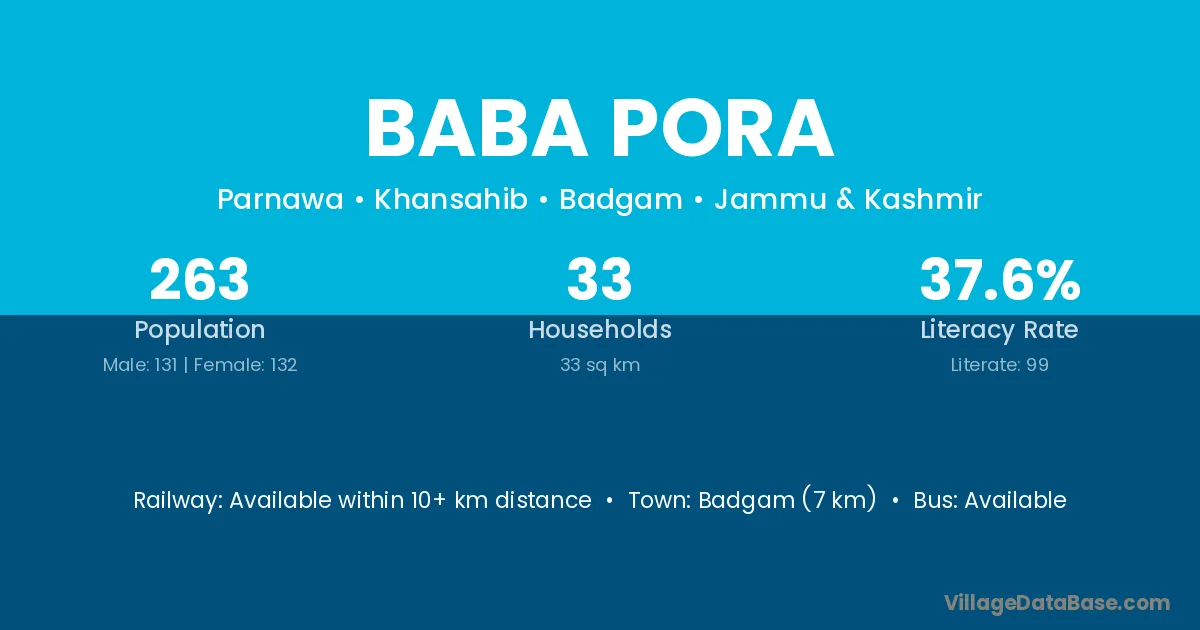Badgam (7 km) is the nearest town to Baba Pora village for major economic activities and is located approximately 7 km away.