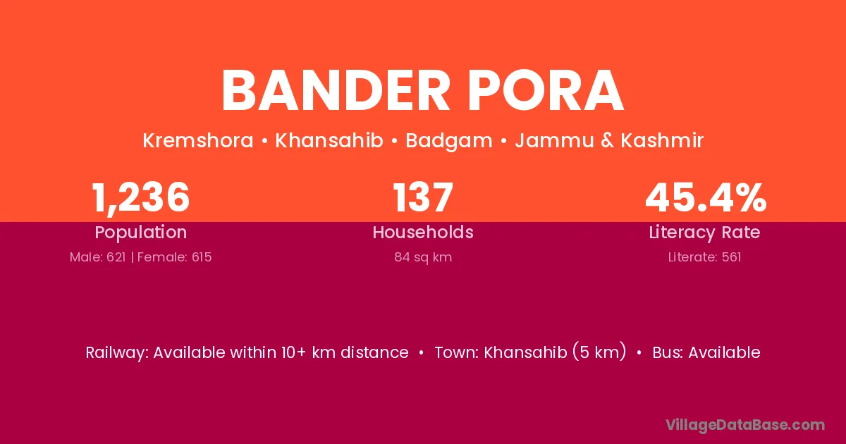 Khansahib (5 km) is the nearest town to Bander Pora village for major economic activities and is located approximately 5 km away.