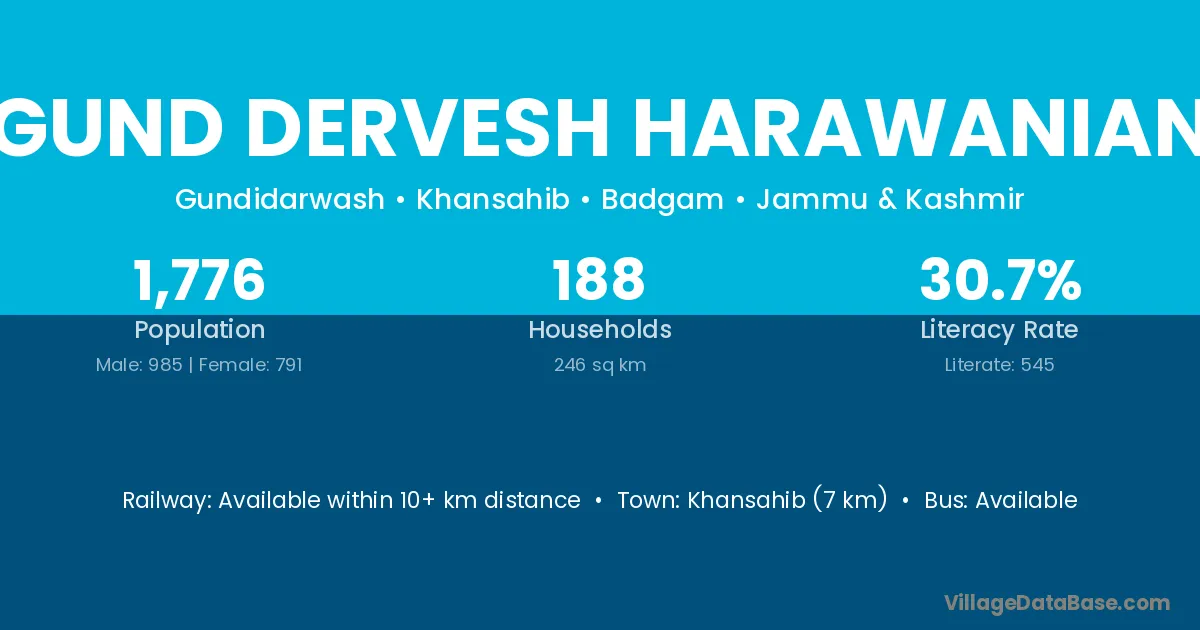The literacy rate of Gund Dervesh Harawanian village is 30.69%. Male literacy stands at 36.95% and female literacy at 22.88%.