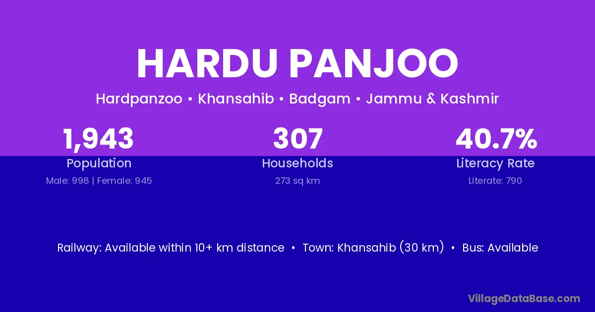 Khansahib (30 km) is the nearest town to Hardu Panjoo village for major economic activities and is located approximately 30 km away.